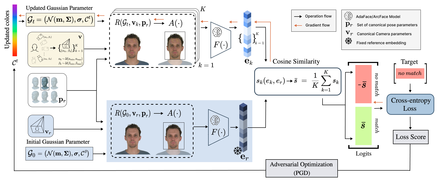 The process adversarially optimizes the color parameters \( \mathcal{C}^t \) of a 3D Gaussian avatar \( \mathcal{G} \) to evade face recognition by the model \( F(\cdot) \). A fixed reference embedding \( \mathbf{e}_r \) is first obtained by rendering the original avatar \( \mathcal{G}_0 \) under canonical camera \( \mathbf{v}_r \) and pose \( \mathbf{p}_r \) parameters, and passing the result through \( F(\cdot) \). During each PGD optimization step, a set of camera parameters \( \{ \mathbf{v}_k \}_{k=1}^K \) is sampled to capture diverse viewpoints. The updated avatar \( \mathcal{G}_t \) is rendered from these viewpoints using the rendering function \( R(\cdot) \) and alignment module \( A(\cdot) \), producing a batch of images. Identity embeddings \( \{\mathbf{e}_k\} \) are then extracted using \( F(\cdot) \), and their average cosine similarity \( \bar{s} \) with the reference embedding \( \mathbf{e}_r \) is computed. This similarity defines the logits ( \( \bar{s} \) for "match" and \( -\bar{s} \) for "no match"), from which a cross-entropy loss is computed while targeting the "no match" class. The resulting loss is backpropagated through the network using PGD to update the color parameters \( \mathcal{C}^t \), yielding an adversarial 3D representation.