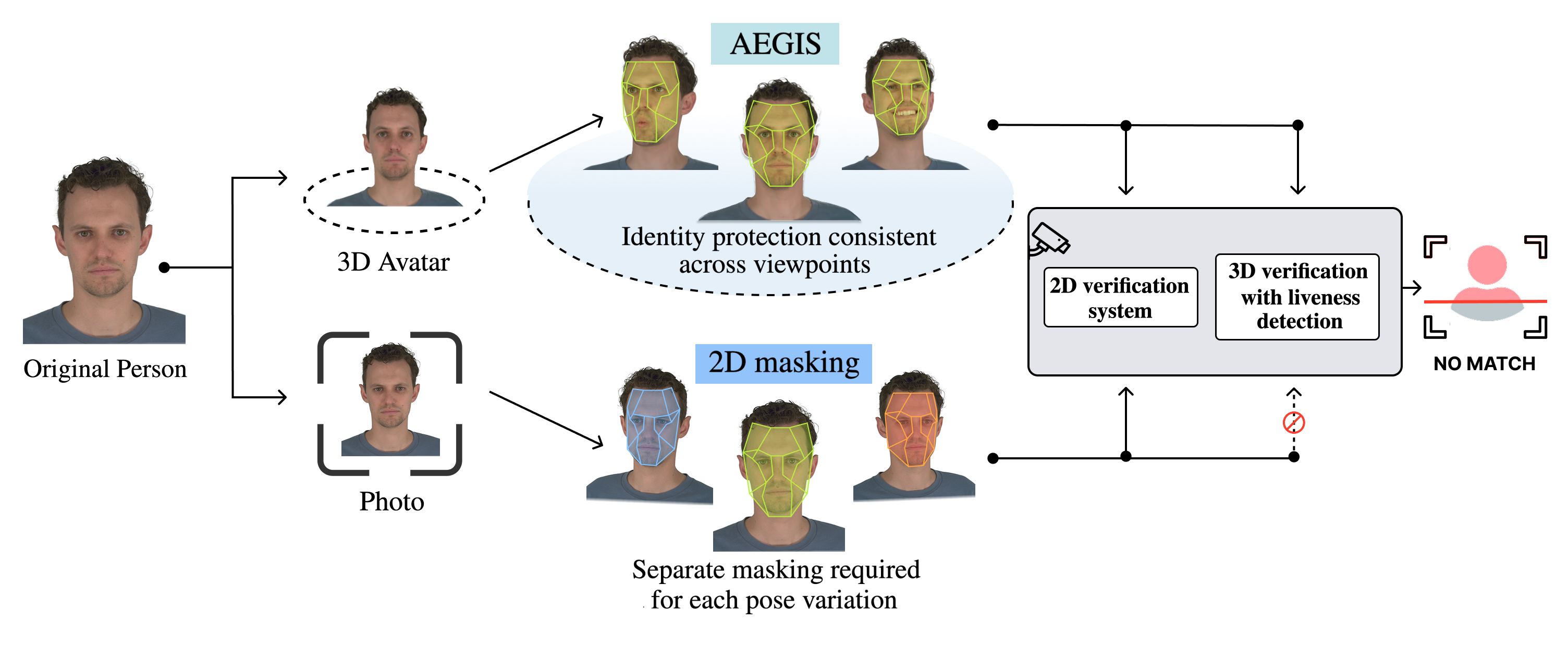The growing adoption of photorealistic 3D facial avatars, particularly those utilizing efficient 3D Gaussian Splatting representations, introduces new risks of online identity theft, especially in systems that rely on biometric authentication. While effective adversarial masking methods have been developed for 2D images, a significant gap remains in achieving robust, viewpoint-consistent identity protection for dynamic 3D avatars. To address this, we present AEGIS, the first privacy-preserving identity masking framework for 3D Gaussian Avatars that maintains subject's perceived characteristics. Our method aims to conceal identity-related facial features while preserving the avatar’s perceptual realism and functional integrity. AEGIS applies adversarial perturbations to the Gaussian color coefficients, guided by a pre-trained face verification network, ensuring consistent protection across multiple viewpoints without retraining or modifying the avatar’s geometry. AEGIS achieves complete de-identification, reducing face retrieval and verification accuracy to 0%, while maintaining high perceptual quality (SSIM = 0.9555, PSNR = 35.52 dB). It also preserves key facial attributes such as age, race, gender, and emotion, demonstrating strong privacy protection with minimal visual distortion.
